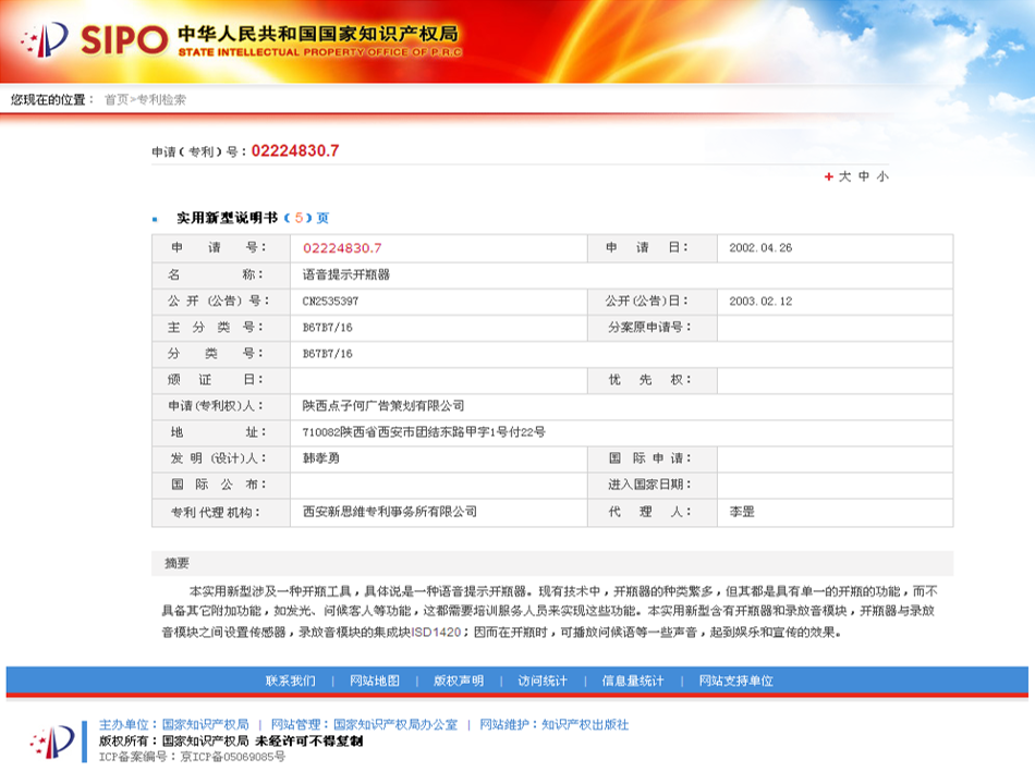 2002 CN02224830.7(2003年申请专利,CN2535397Y公开)声音提示开瓶器。