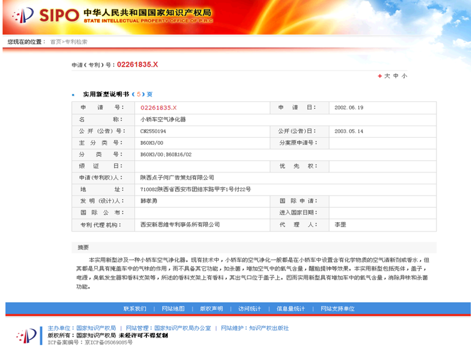 2002 CN02261835.X(2003申请获得批准,公开号为CN2550194Y)汽车空气净化器。